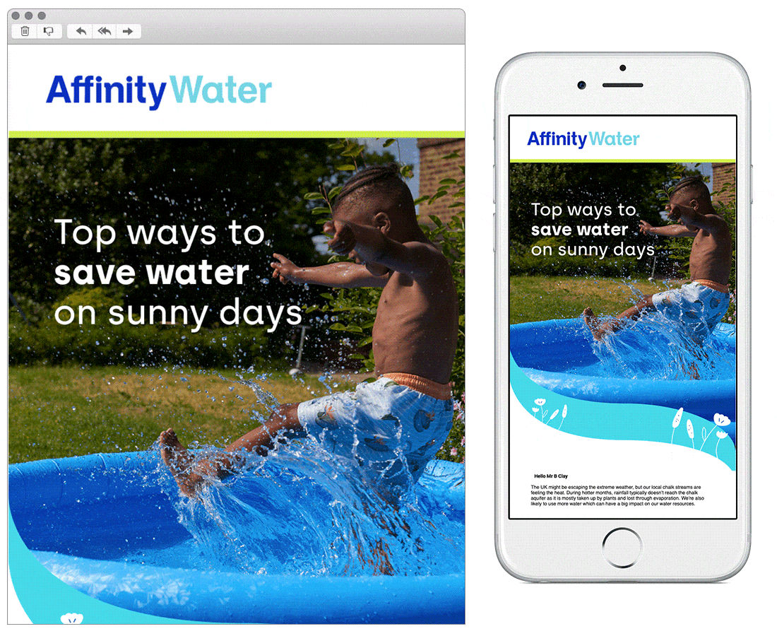 With its fresh, calming colour scheme and fluid design, this email instantly connects the reader to its theme of water, telling a story beyond its words. Whilst perhaps a little copy-heavy, the messaging is clear, informative and the accompanying lifestyle imagery helps convey Affinity Water’s points well.
