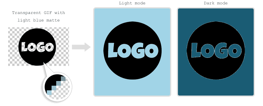 Where possible, avoid using transparent GIFs. A transparent GIF includes a small amount of the intended background colour around the edges of the image - this is called the ‘matte’ colour. If the background colour in the HTML matches the matte colour, the image looks fine. However, if the background is inverted in dark mode, the image will have a visibly jagged edge.