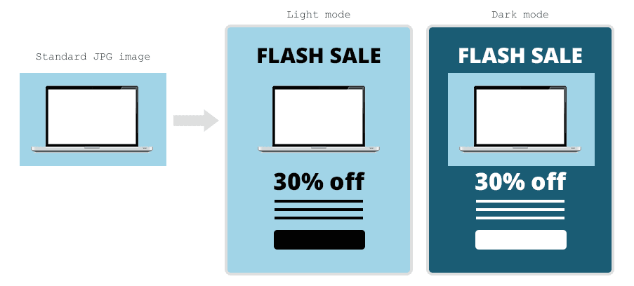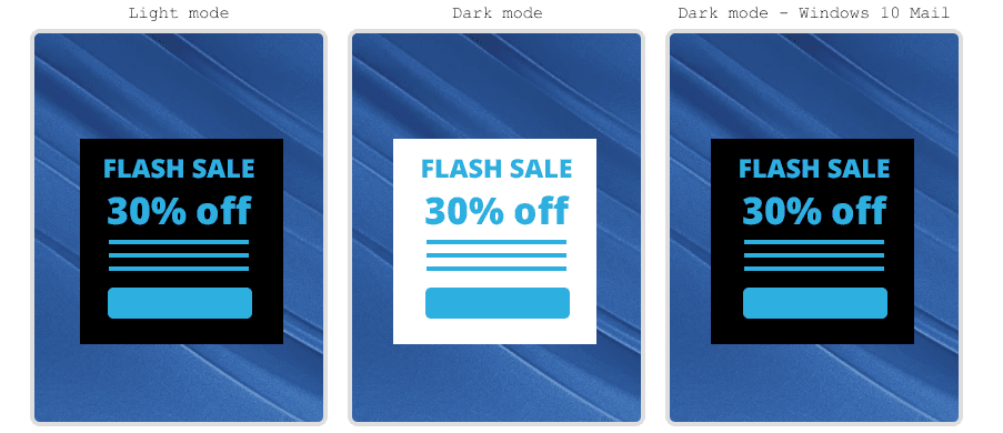 Finally, in some email clients it is possible to detect if dark mode is enabled, and use a media query to swap the image source to an alternative image for these recipients. This is not supported everywhere, and it will still be necessary to consider how the image will appear for dark mode users on platforms that do not recognise the media query. Here we explain how to swap images for dark mode, or take a look at our example below: