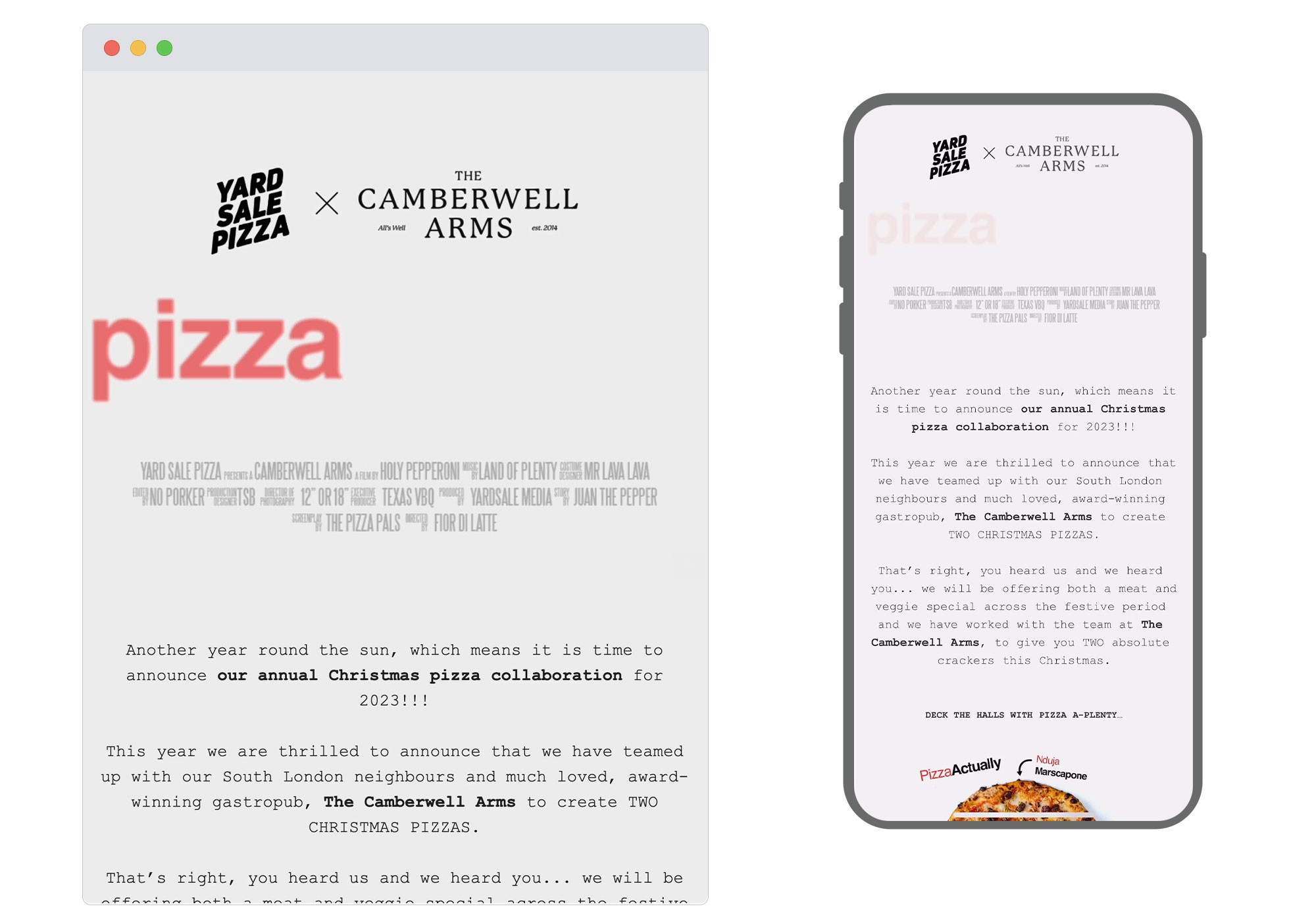 No matter where you stand on Love Actually (can you love and hate a movie at the same time?!), there’s no denying that it’s become one of the most iconic Christmas films of recent years. So Yard Sale’s simple but effective design is gimmicky in all the right ways: instantly recognisable, relatable, festive and fun. We also love the pizza snow globe in the secondary blocks. Oh, to be in a snowstorm of pizza….. (Drifts off dreamily)