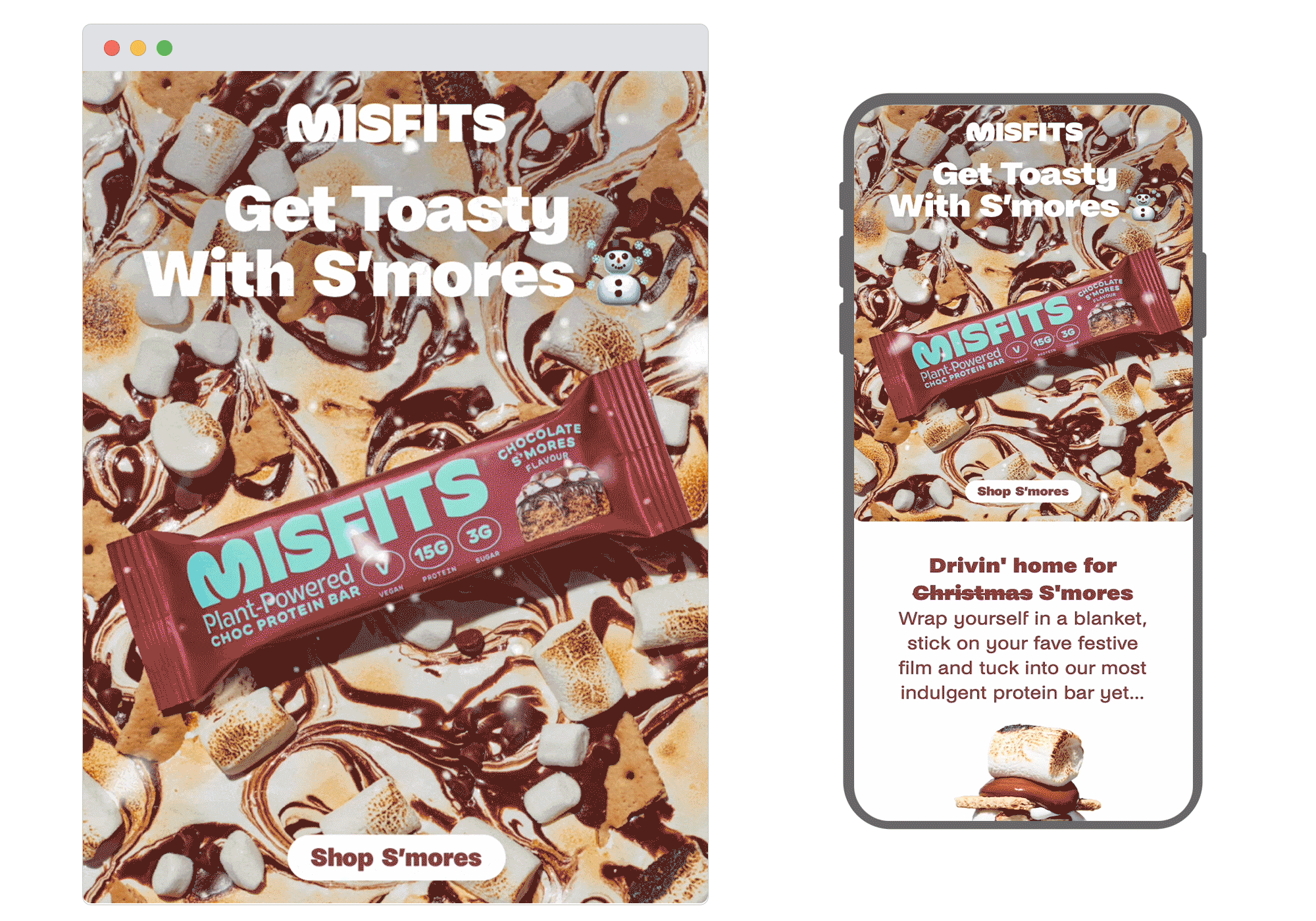 And what a pretty snowstorm it is, thanks to the realistic animation Misfits has used in the hero. Within the copy, they’ve layered festive song references on top of cosy Christmas scenes to bring the appeal of their product at this time of year right up. And the visually delicious way of listing the product’s ingredients makes it even more enticing. S’mores for our stocking fillers, please!