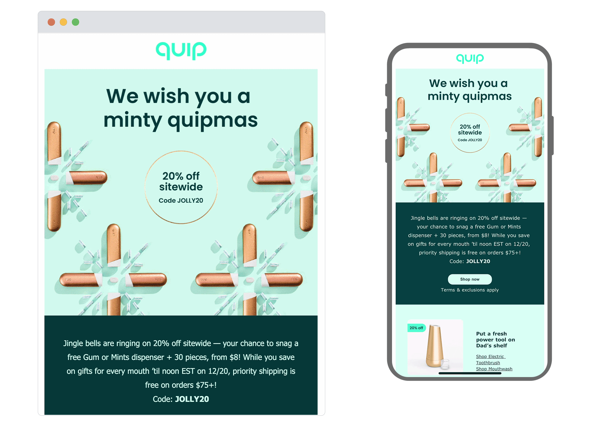 With a brand name like ‘quip’, it’s wise to make any copy you put out there strong. Luckily, they’ve done just that in this email. With humour throughout, puns a-plenty and festive themes a-flowing, they’ve well and truly cracker-ed it (soz), particularly in the product headers. We also like the module at the bottom that uses a calendar design to highlight final order dates before Christmas. Oops, we mean Quipmas.