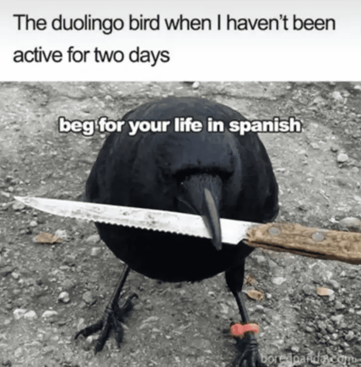 At the core of Duolingo’s viral success, is a unique brand personality, projected through the humanisation of their mascot, Duo. This cheeky character is the face behind Duolingo’s famously passive-aggressive push notifications (more to come on that!) and is also the star of their highly entertaining TikTok content. This content varies between funny sketches and attempts at viral challenges but also spotlights its appearance at high-profile events including the Barbie World Premiere. These bizarre appearances demonstrate Duolingo’s impressive ability to elevate brand awareness by tapping into pop culture and speaking to the interests of its Gen Z and Millennial audience.