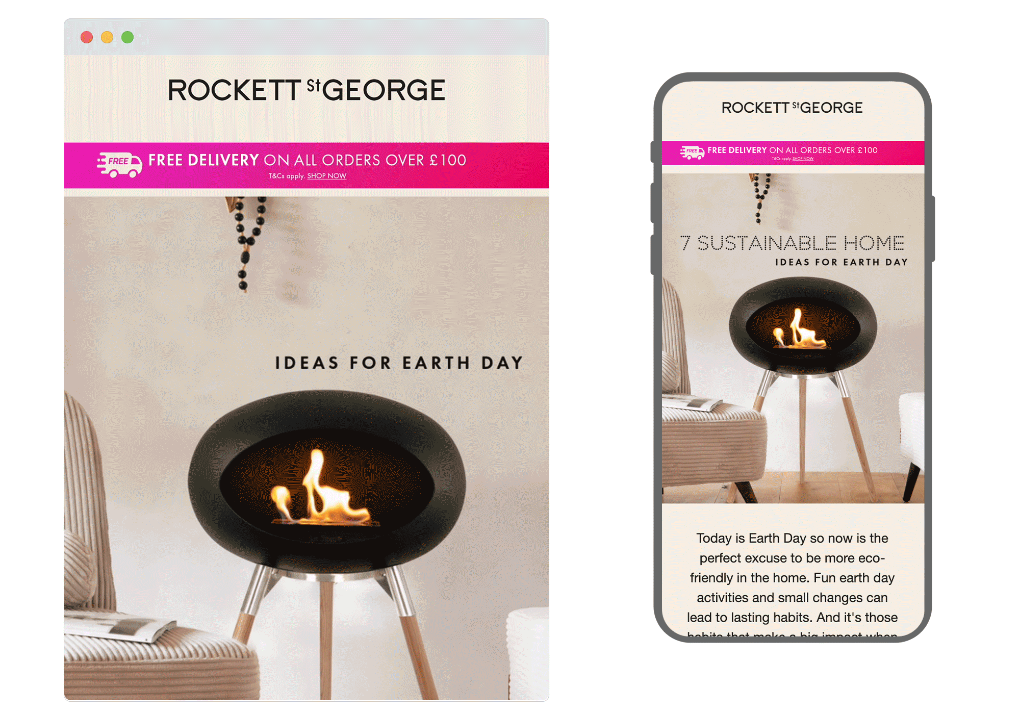 Rockett St George does a great job of involving their customers in the narrative of their Earth Day email, proposing the challenge of making small, sustainable changes in their home. They then present a selection of items of which can help achieve these changes, using blocks and colour to break up the content into bite-sized chunks. This choice of layout makes the whole interaction feel conversational and pleasant, as opposed to a hard sell of their products.
