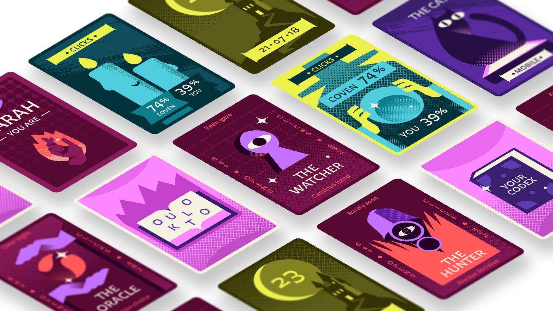 Creatively, that meant bold illustration, a limited colour palette, and a determination to make ridiculously long GIFs while keeping file sizes (just about) under control. Tarot-style cards felt like the perfect storytelling device – strong visuals, mobile-friendly, and a nod to that Halloween mystique.