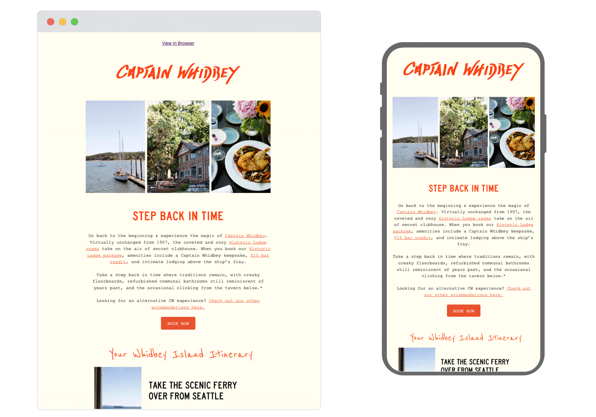 An extremely pleasing design which takes the reader on a journey, encouraging the eyes to glide down the entire email. We love the 'itinerary' section which is not only helpful for visitors but clear to understand, even for those who are completely unfamiliar with the area. The hand-drawn illustration at the bottom is a nice touch too, accentuating the sentimental ‘step back in time’ theme.