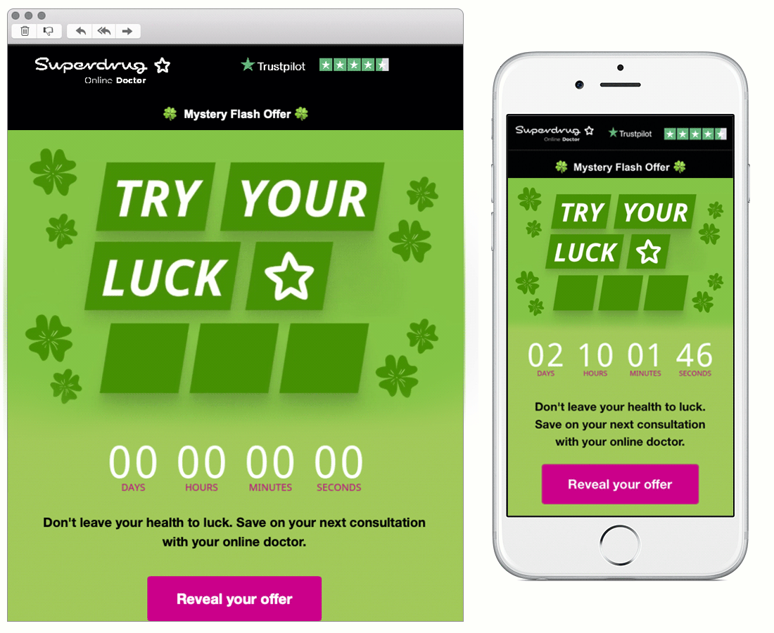 Theme. There’s no mistaking the theme of this email and it’s awesome to see Superdrug really embraced St. Patricks Day! The animation and live countdown clock are a great way to start the email, exciting the reader to click through and reveal their offer.