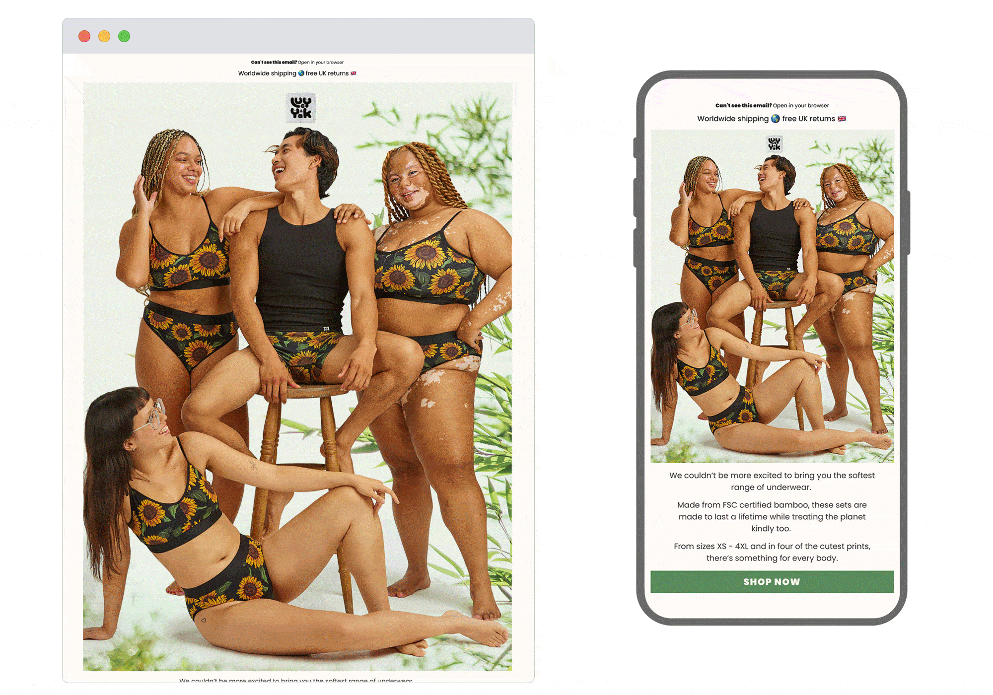 This email grabbed our attention for all the right reasons. Its layout is simple but holds the eye, thanks to the lovely product photography which includes realness that makes your heart glad. We love the unique ways Lucy & Yak have promoted their USPs, especially the bamboo/pant visual which gets across an important point that may be missed if just relying on copy.