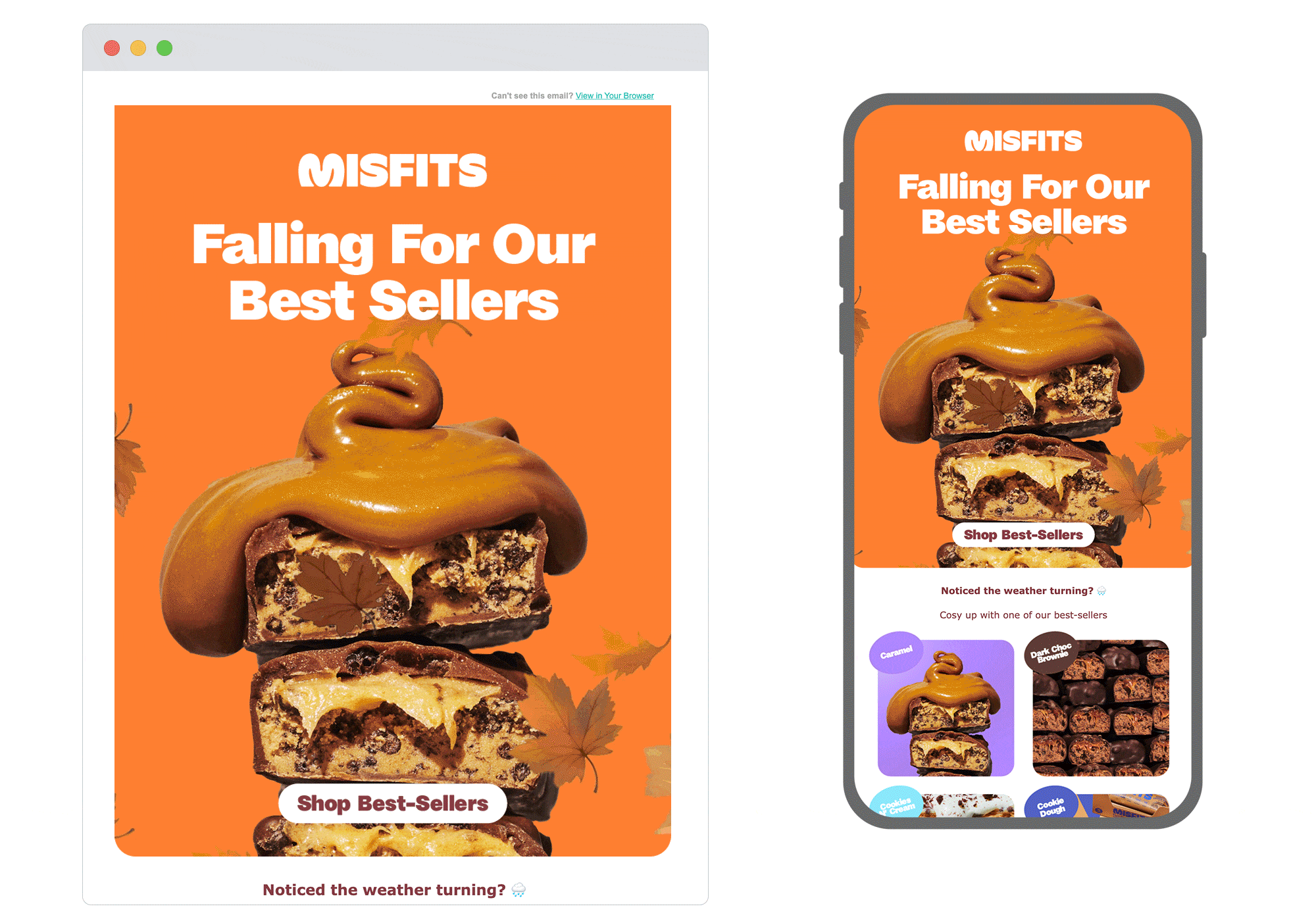 We love how each element of this email complements the others. Starting with the subject line, through to the Autumn-themed design featuring falling leaf animation and rich hues, to the impressive product photography that screams ‘comfort food this way’.
