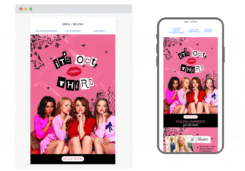 The theme might be niche, but it’s pretty topical and on-trend for Milk + Blush’s audience (if you know the movie Mean Girls, you’ll get the October 3rd reference). They’ve fitted quotes and scenes from the movie in with their product range in a fun, relatable way, and having it drop into our inboxes on 3 October is their excuse to promote them. Get in loser - we’re going shopping (at Milk + Blush).