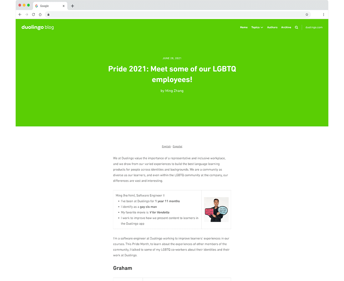 Language learning app, Duolingo, is known for including LGBT+ characters and narratives in its lessons. They feature blog posts written by staff, with testimonials from their LGBT+ employees. These blogs share personal stories of inclusion and representation, emphasising the company's commitment to diversity. Elements like this demonstrate Duolingo’s authenticity, allowing their customers to connect with real people. The diverse voices and experiences humanise the brand image, making it relatable and trustworthy. It also indicates there’s work going on behind the scenes to provide support and community within their workplace.