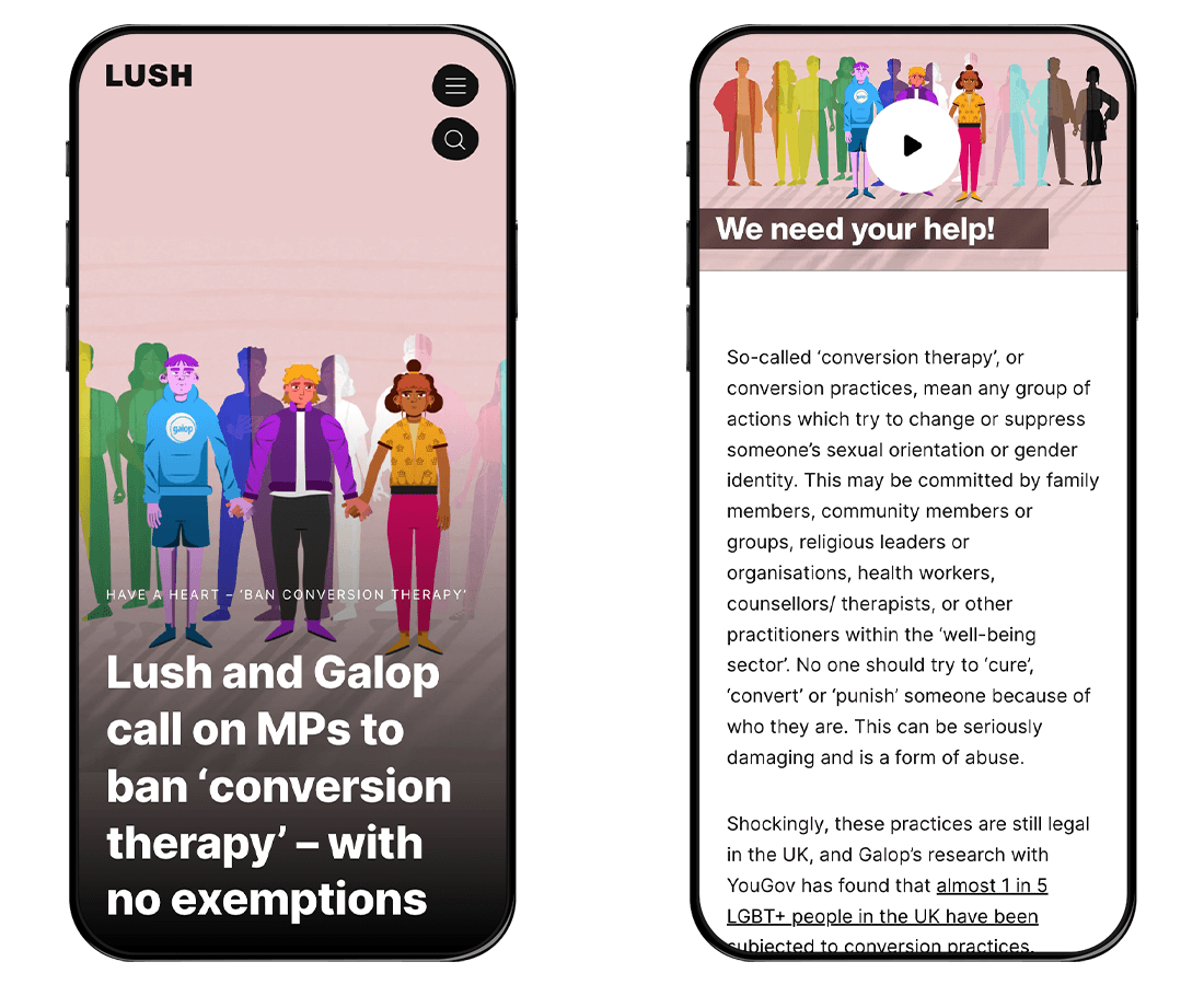 The cosmetics brand, LUSH, partnered with the LGBT+ charity Galop to campaign against conversion therapy. They included a dedicated page on their website that provided information on the issue, a template for customers to write to their MP about banning conversion therapy, and also outlined how their profits were being donated to Galop. Their transparency in how they were contributing to the cause demonstrated genuine commitment, helping to build trust between them and their LGBT+ audience and beyond. So yes, they may have upped the rainbows on their branding and products, but they also supported the cause whilst educating their customer base, demonstrating a clear alignment between their marketing and company values.