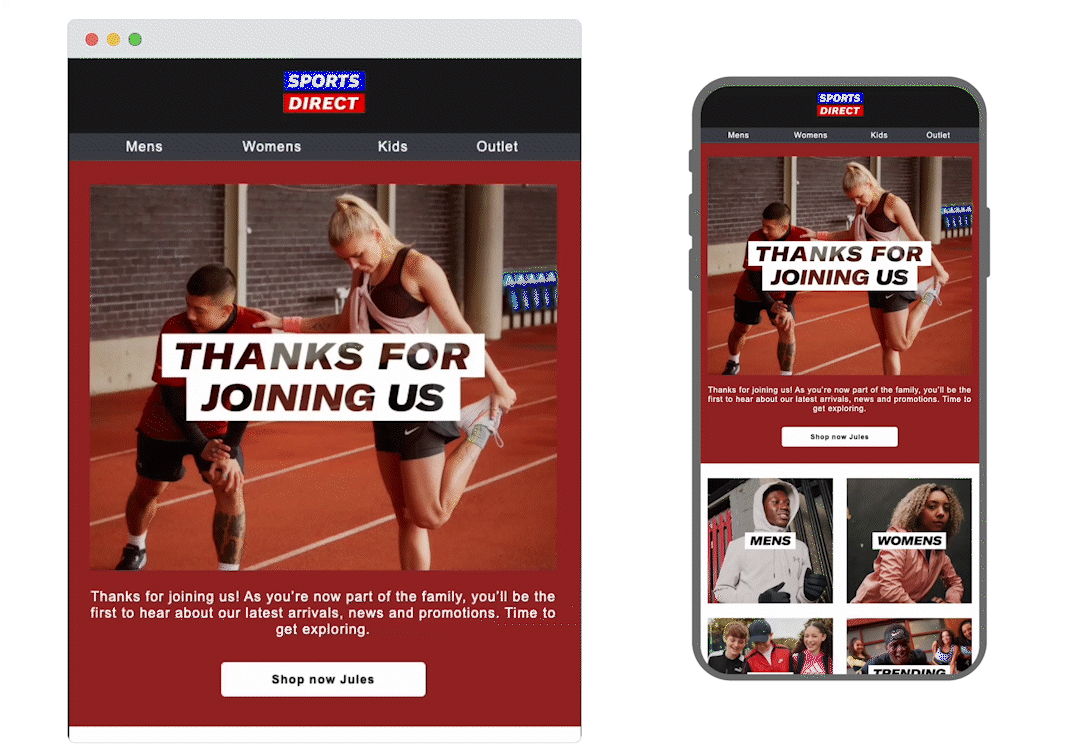This email from Sports Direct is the beginning of what could become a special relationship. You’re ‘part of the family’, they’re taking you on a journey and they want to be there for you every step/kick/cartwheel of the way. Using first-name personalisation in the subject line is nice, but they’ve taken it further by including it in the CTA too. There’s also the promise of a gift on your birthday if you create an account and share the date with them - more data for them, more sports goods for you. A win for everyone!