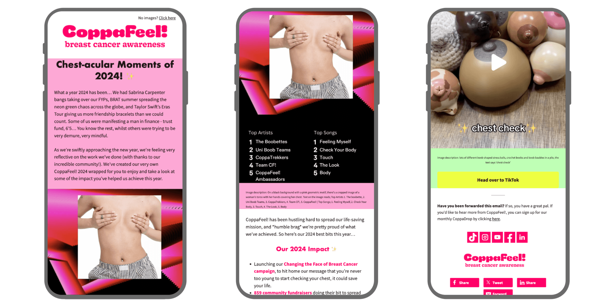 We also love the breast cancer awareness charity CoppaFeel’s cheeky nod to the Spotify Wrapped format in their review email, in which they outline their 2024 impact with pride.
