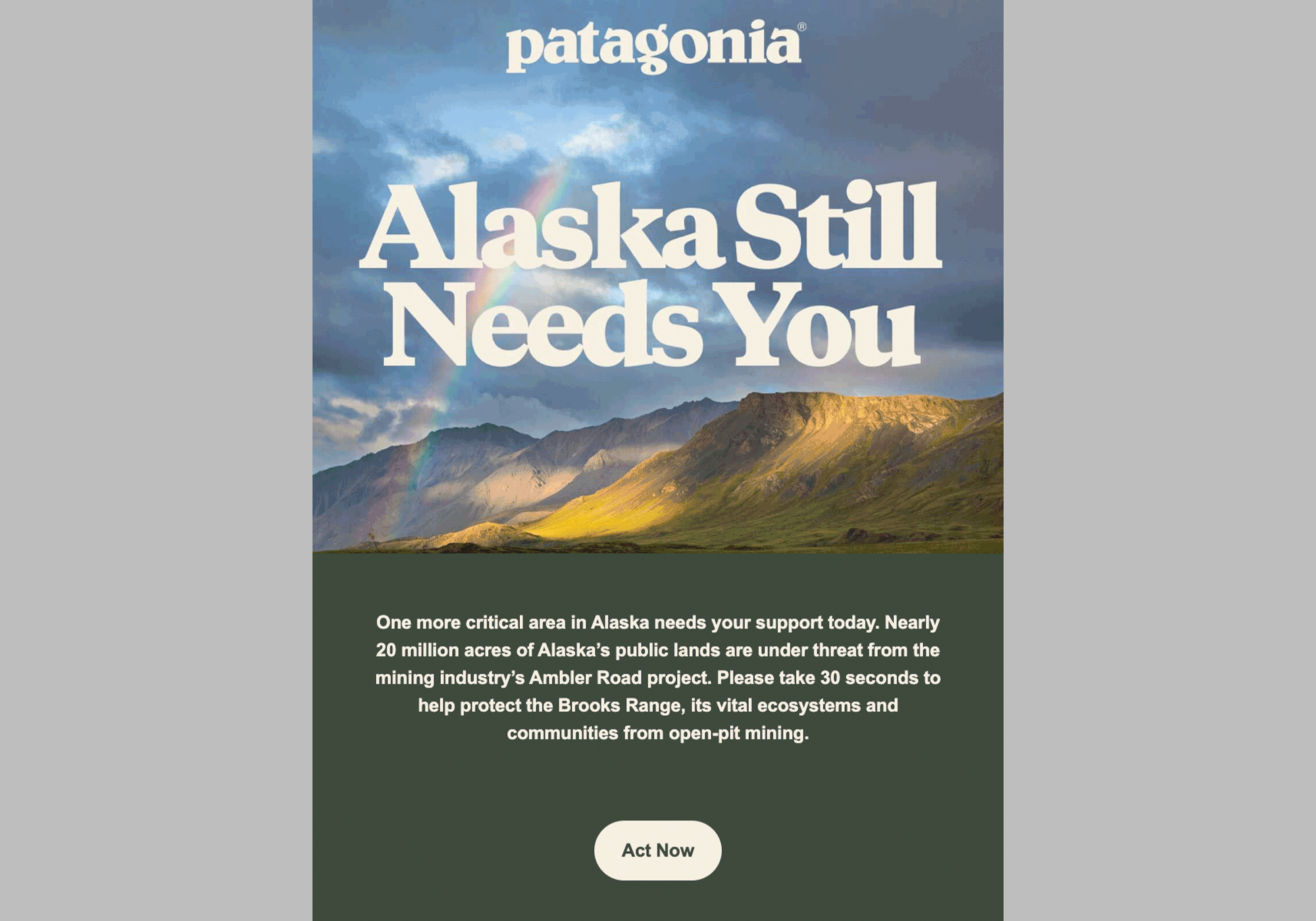 Here, Patagonia captures the balance of urgency and hope, using powerful storytelling, evocative imagery, and a focused ask to rally their community toward meaningful action. Featuring lush bold fonts, stunning visuals of Alaska, and actionable CTAs like ‘Act Now’ and ‘Donate’, the email inspires both connection and trust. The option to give on behalf of someone else cleverly ties generosity into the season of gifting, while the spotlight on their climate-focused partners adds depth and accountability to the campaign. Finally, the “Earth is now our only shareholder footer.” reinforces that this isn’t a performative one-off email – it’s a true reflection of Patagonia’s brand values and mission.