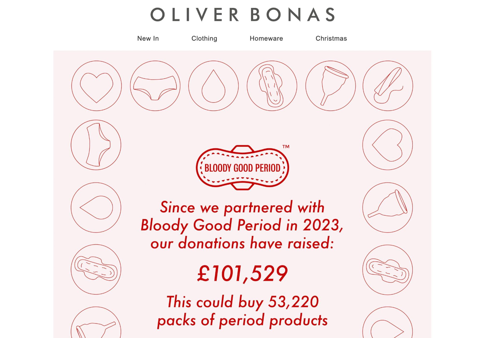Oliver Bonas’ collaboration with Bloody Good Period isn’t just a seasonal highlight – it’s a long-term commitment, with donations totalling an impressive £101,529 in 2023 alone. That fact makes this email’s clean and playful design even more palatable, with iconography that mirrors the cause and reinforces the message. Alongside the pledge to extend the partnership until 2025, the inclusion of charity-linked products encourages customers to shop for good, with proceeds from every purchase going to the cause. This is a perfect example of how to pair a corporate-charity partnership with purpose and impact.
