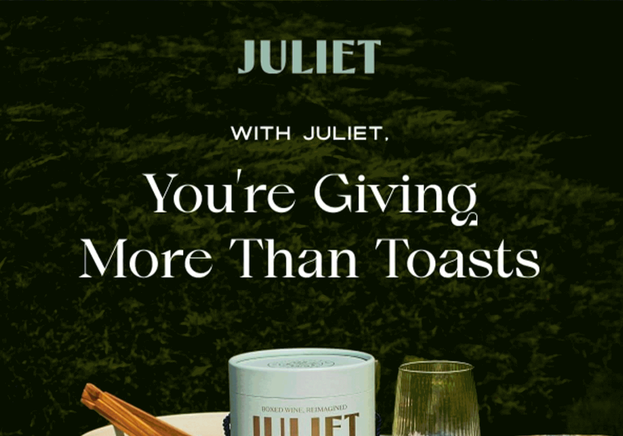 Juliet nailed Giving Tuesday by transforming sustainability into a lifestyle choice. By tying purchases to a broader mission, they remind customers that every sip can help protect the planet. The email’s stunning visuals – featuring recyclable packaging and lush al fresco shots – complement the sophisticated yet accessible tone of their copy. Phrases like “sipping with less glass and more class” encapsulate their brand voice perfectly, while the highlighted stats about lower carbon emissions and reforestation projects ground the messaging in tangible results.