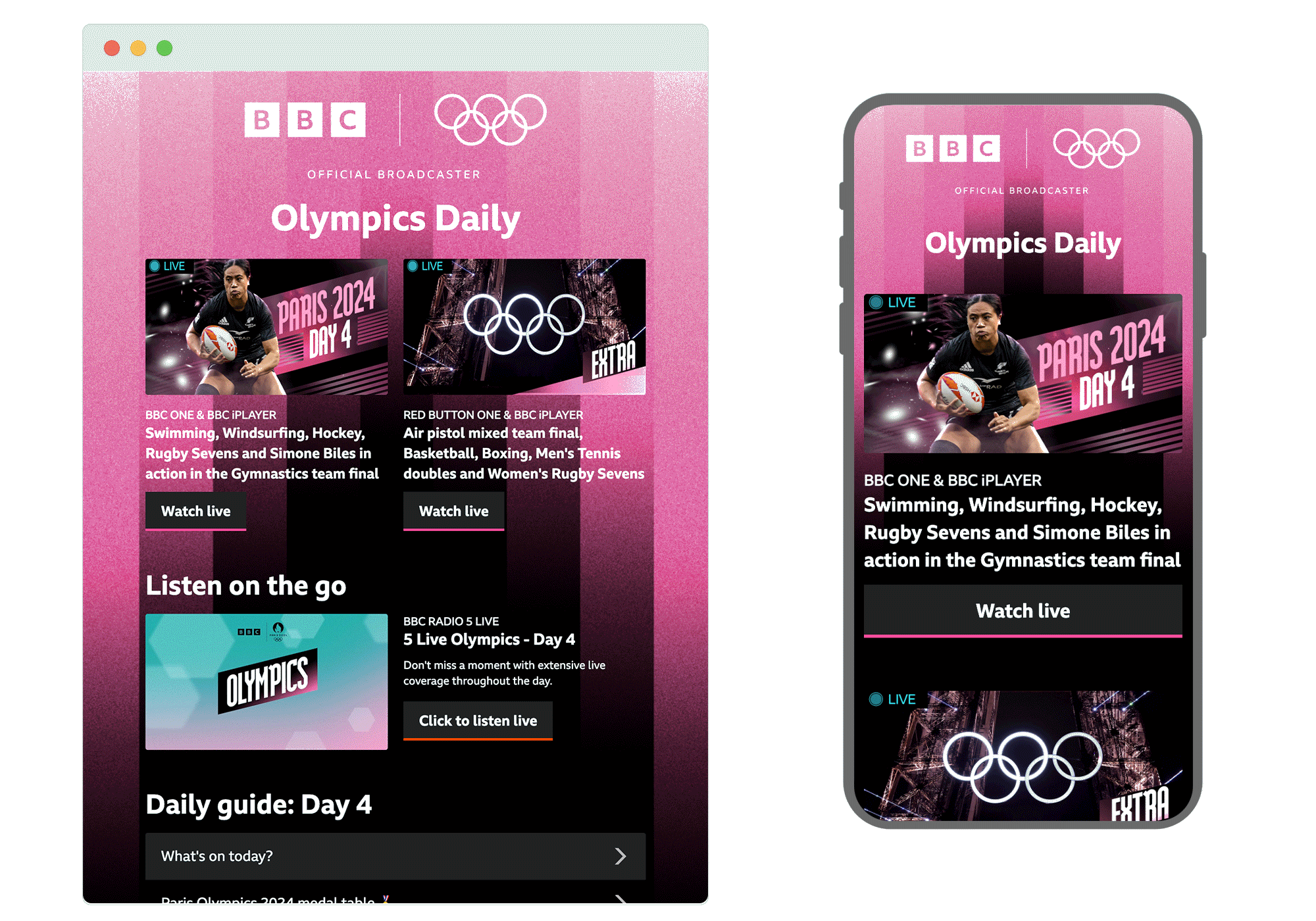 This is one of many ActionRocket-made emails that we’re very proud of! The daily BBC round-up email of the Olympics includes live watch and listen links, as well as live updates. These are supported by news and interviews to offer additional engaging content and the latest news. An example of a dynamic email that reflects the brand and its ever-changing content brilliantly, if we do say so ourselves.