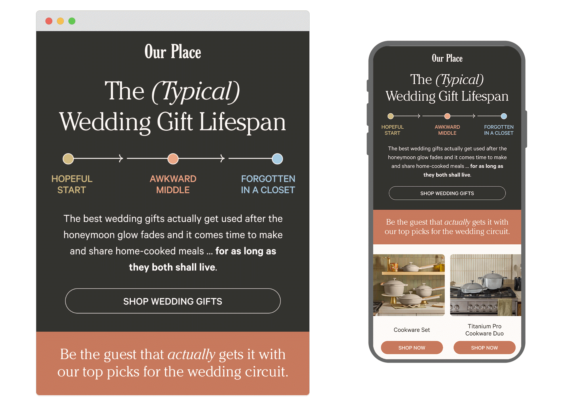 This well-timed email taps into wedding season and the gift-buying stress it brings. From the subject line, to the hero block’s diagram-style image and witty body copy, right through to the final block’s content, the storyarc flows to convince the reader why cookware from Our Place is the right wedding present choice.