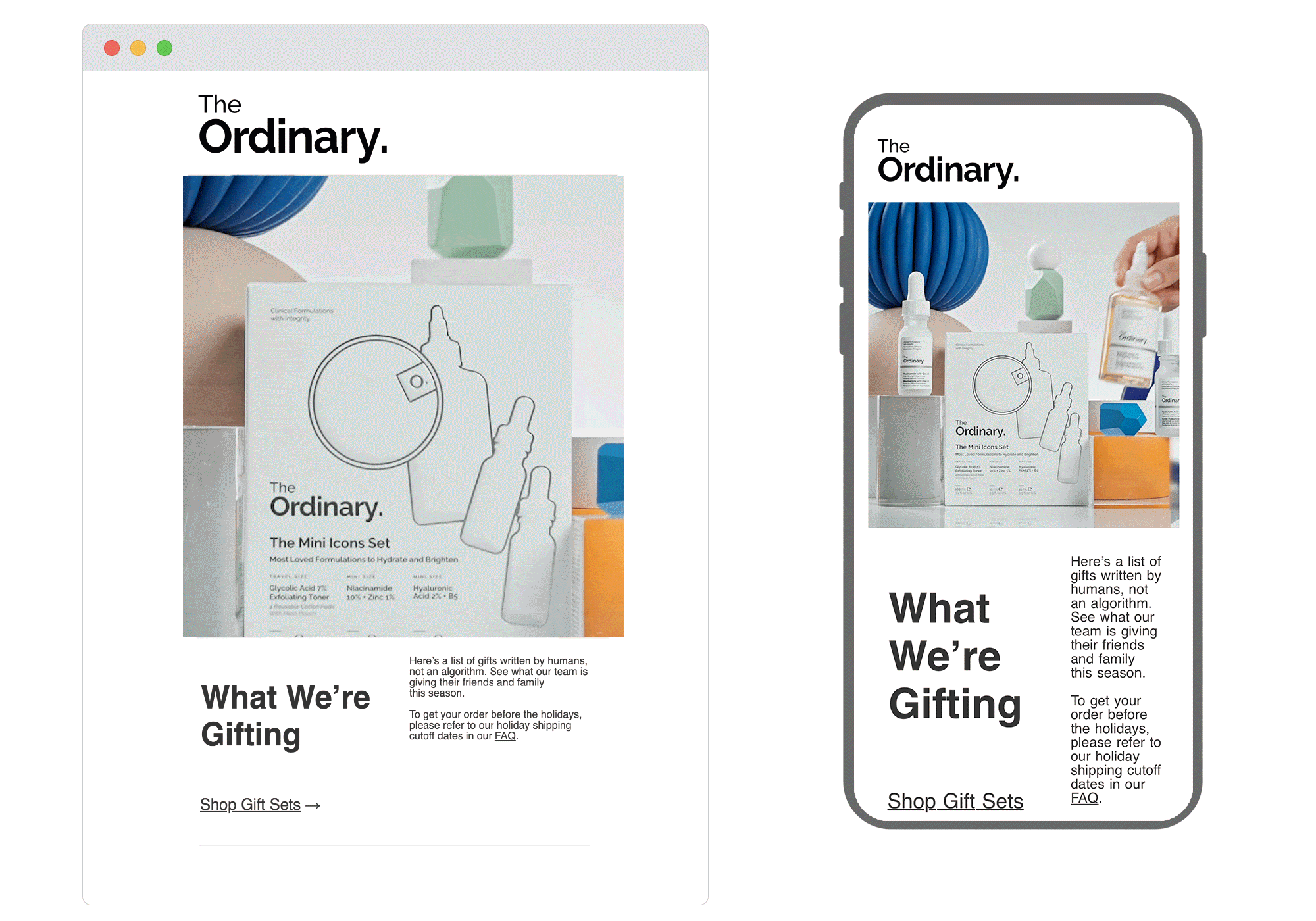 The Ordinary nails the gift guide format by making it feel genuinely personal rather than another product push. Each gift recommendation is addressed to a named recipient ("Jessica, Digital" / "Vanessa, Digital" / "Janu, Brand") with copy that reads like you're getting advice from a friend who actually knows skincare. The descriptions explain not just what's in each set, but why it suits that particular person's needs and lifestyle. It's the kind of thoughtful gifting logic that makes you think "oh, that would be perfect for..." rather than just scrolling past. The Ordinary transforms a standard seasonal email into something that feels helpful and human – exactly what you want when you're stuck for gift ideas.