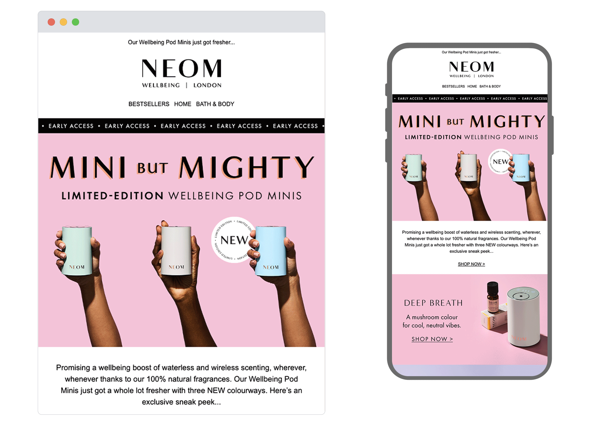 Neom keeps it straightforward with this stylish email showcasing their Wellbeing Pod Minis. The soft pastel colours and minimal layout highlight the three new colourways and make it easy to focus on the product. The copy is tight, giving just enough detail to explain the pods’ appeal without overloading the reader, while the “early access” messaging adds a touch of exclusivity, encouraging clicks. Neom’s approach shows how clear design and focused content can make a product launch email stand out.