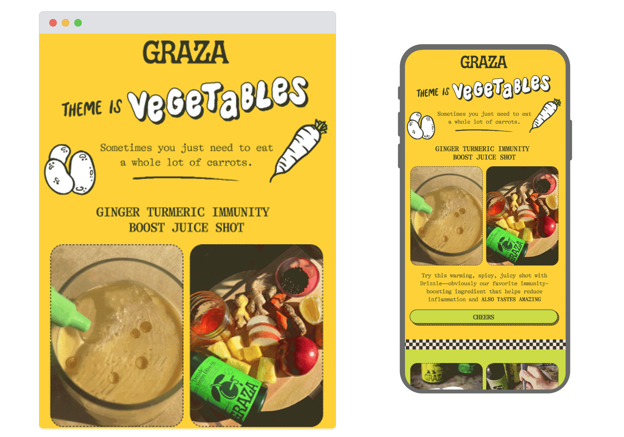 Here Graza takes a vegetable-themed campaign and serves it with a side of fun, dynamic creativity. The subtle movements and playful elements bring life to the content, making the entire email feel fresh and engaging to brighten up inboxes. Plus, extra points for the outside-the-box CTAs (“Miso hungry”). Whether it’s the charming illustrations or the mouth-watering visuals, this email leaves a lasting impression — and makes us want to cook.