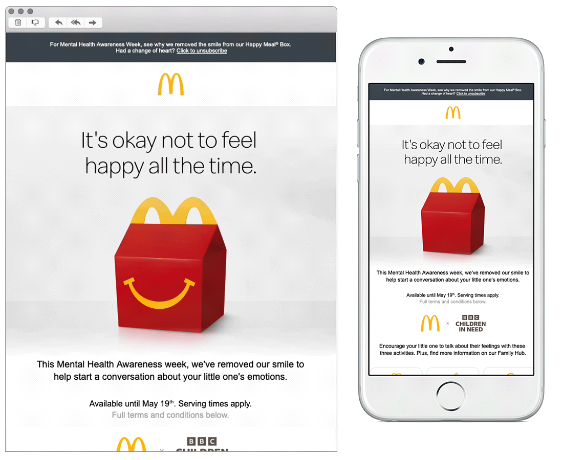 This email from McDonald’s is a clever, sensitive approach to Mental Health Awareness Week. As part of their multi-channel campaign, they reframed their iconic Happy Meal and presented it as a tool to start conversations with children about their feelings. Not only is it addressing the little one’s emotions, but it’s equipping parents and carers to think more about how to approach these topics. And only the most subtle of product pushes in the bottom corner is evident. Classily done.