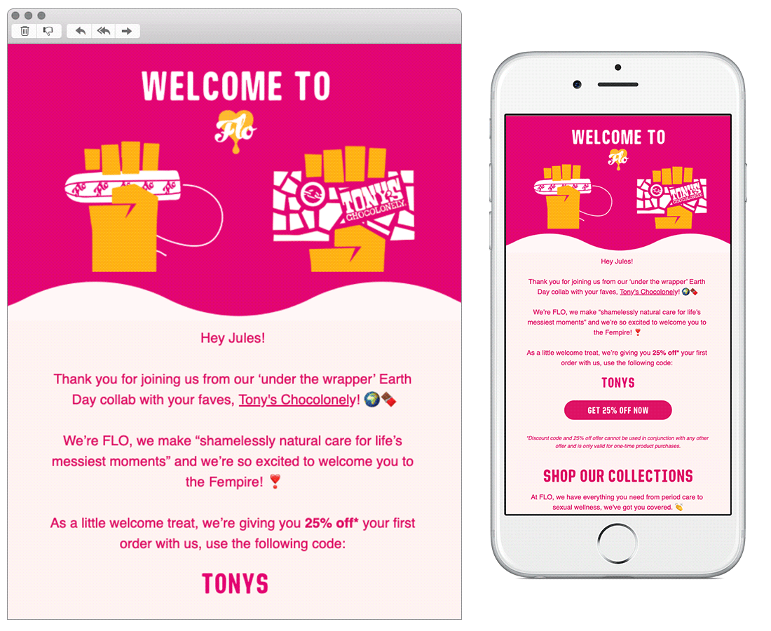 This pair was picked as a demonstration of the ideal welcome/activation journey. The first email was received after entering a competition collab from FLO and Tony’s Chocolonely. We love the aligning collab logos and the Tony’s-specific discount code is a nice touch. And the copy…’Fempire’ - TICK! The second email is a follow-up reminder about the sign-up discount in their last email, with the TOV, branding and UGC content affirming FLO knows how to interact with their audience.