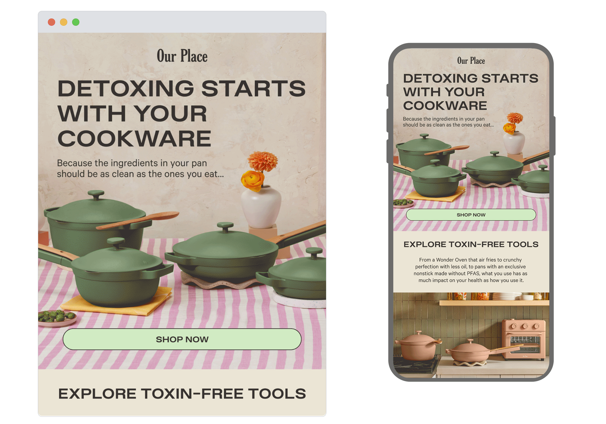 This alternative take on clean eating is an interesting angle. Our Place has spun the summer detox message on its head, stating that it begins with cookware rather than the food cooked inside it. It’s an effective story arc that got us thinking about something rarely considered; a storytelling success that makes for powerful marketing.