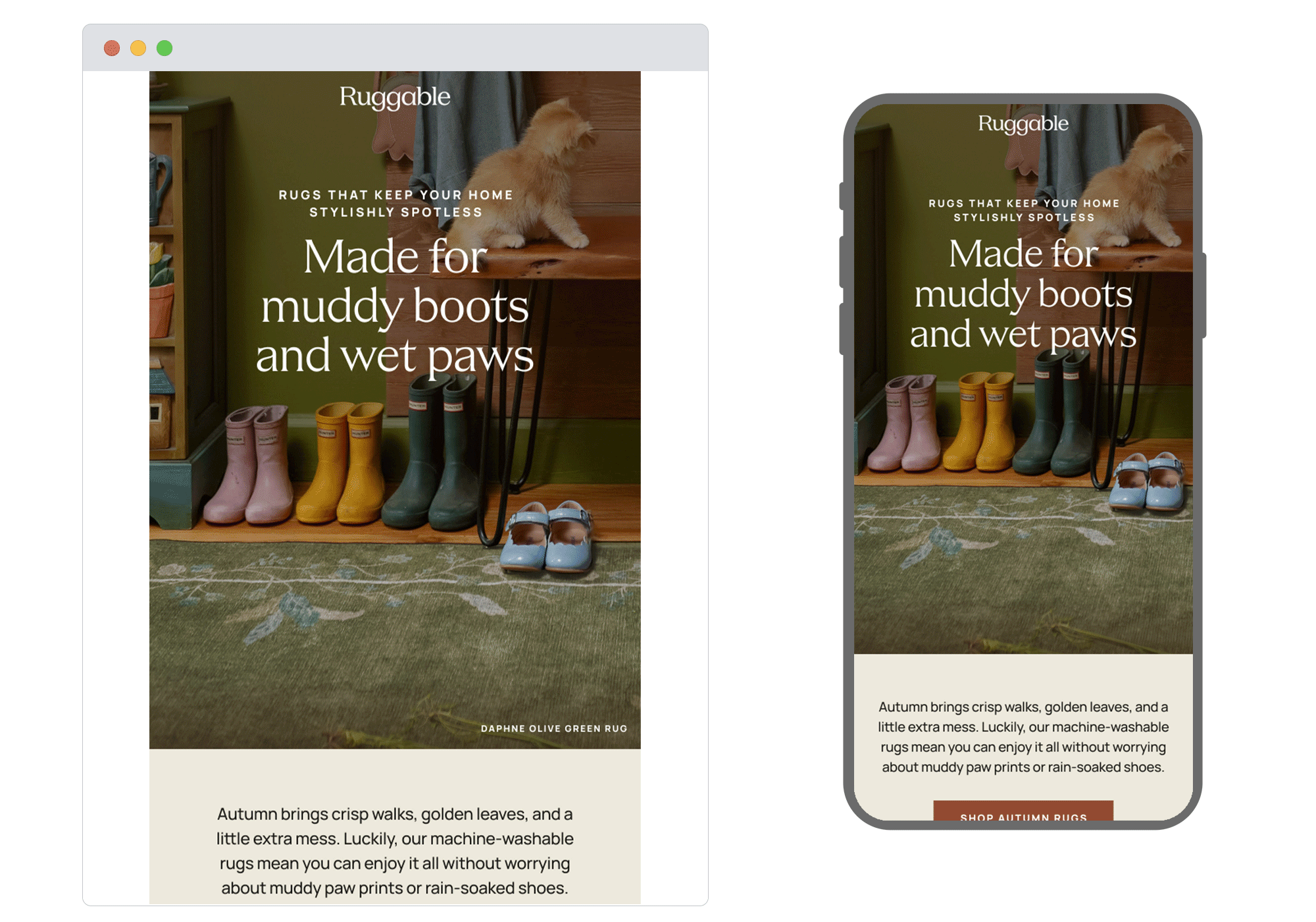 Ruggable has expertly leaned into autumn in this email’s narrative. The copy weaves in seasonal outdoor moments, autumn resets and indoor cosiness, gently projected across a range of audience demographics. With the images’ muted gradient and rich tones subtly bringing us into the darkening days of September – it’s safe to say, we’re definitely in Ruggable’s season.