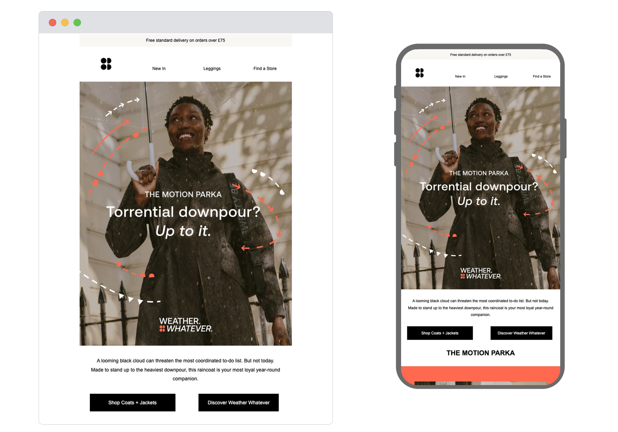 We love the hero’s text over image for the headline, along with the slogan at the bottom. That, plus the dotted lines and arrows detail throughout creates a pleasing, cohesive flow, which the well-crafted copy strengthens further. With both USPs and UGC included, this product relaunch email from Sweaty Betty – much like the parka itself – covers everything.
