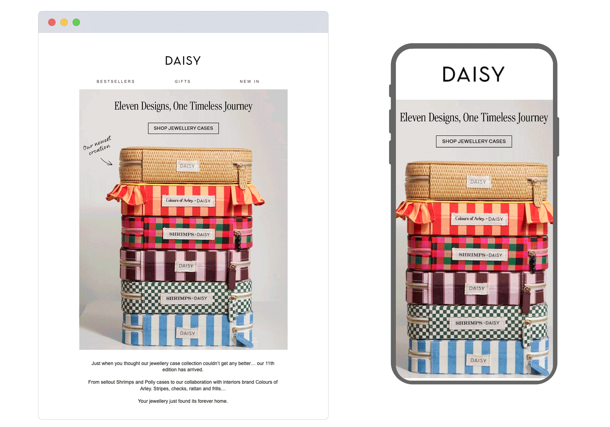 How to showcase multiple products? If in doubt, stack them up! We love Daisy’s hero GIF, especially the cute handwritten notes feature that’s used to highlight each case’s USP. The USPs continue seamlessly into the secondary blocks, and with a UGC element also tied in, the result is a very compelling email.
