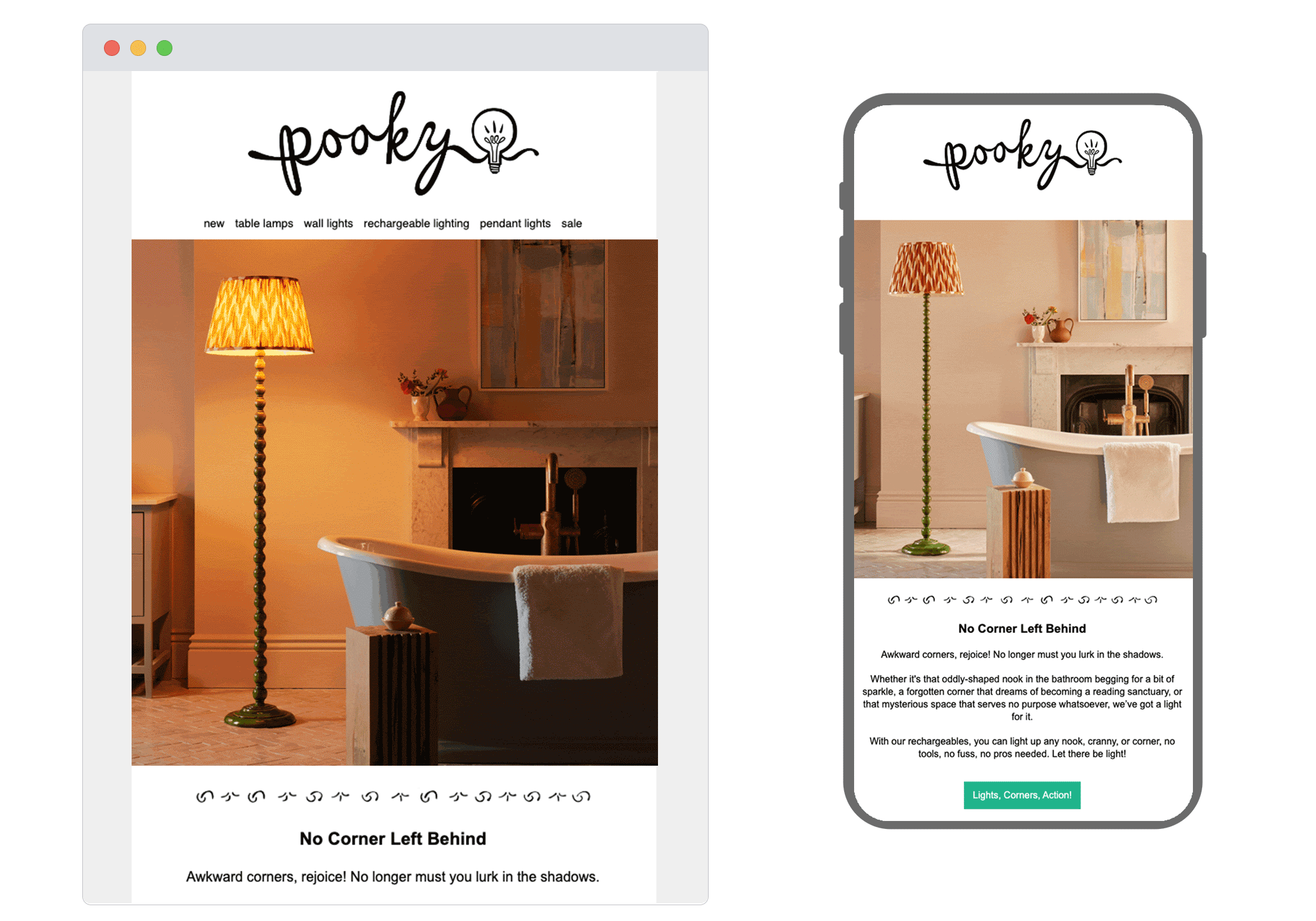 This hero image features a simple yet effective animation, showcasing Pooky’s product in varying environments beautifully. Following that, the quirky copy encourages us to consider lamps for every scenario. Its quirkiness continues into the CTAs, which, whilst fun, isn’t the best option for accessibility. And with an email that shines this much, we’re all for making it accessible too.