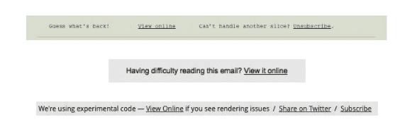 Including it at the top of your email design would make it easier in all those instances for users to get the experience they want. If the above is important to your recipients, making the text 12px and low contrast is not the way to go!
